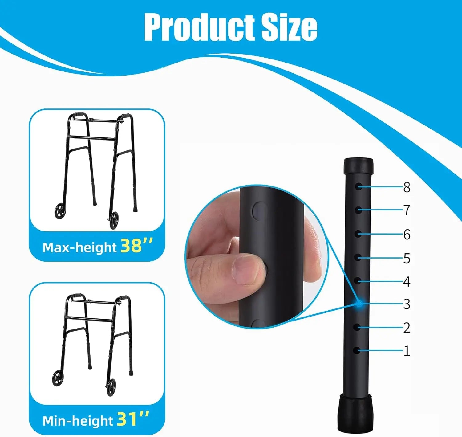 Easily adjust the walker from 31" to 38" with a simple snap-button system. Perfect for users of varying heights, ensuring a comfortable and safe walking experience.