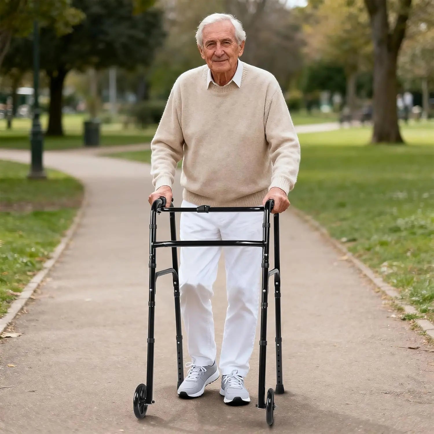Designed for outdoor use, this walker provides steady support on sidewalks, driveways, and uneven paths. The lightweight yet durable frame helps seniors move with confidence while maintaining balance and control outdoors.