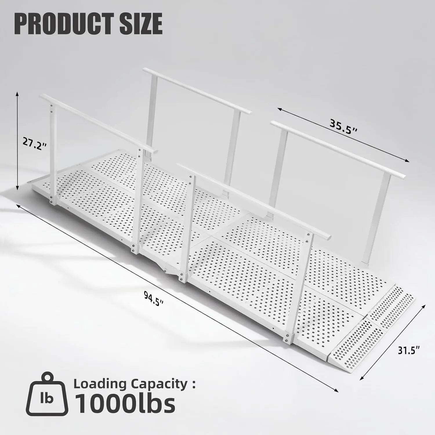 | Ramp Length | 45.2‘’(Base) / 94.5‘’ (Extended) | All-Weather Deck | Open-mesh, waterproof & rust-proof (Extended) |
