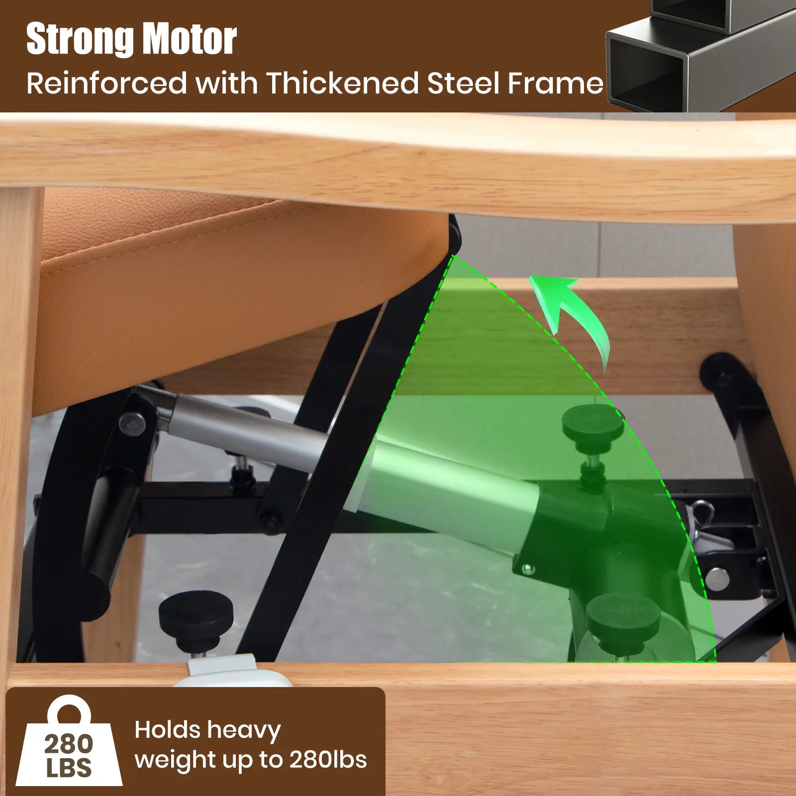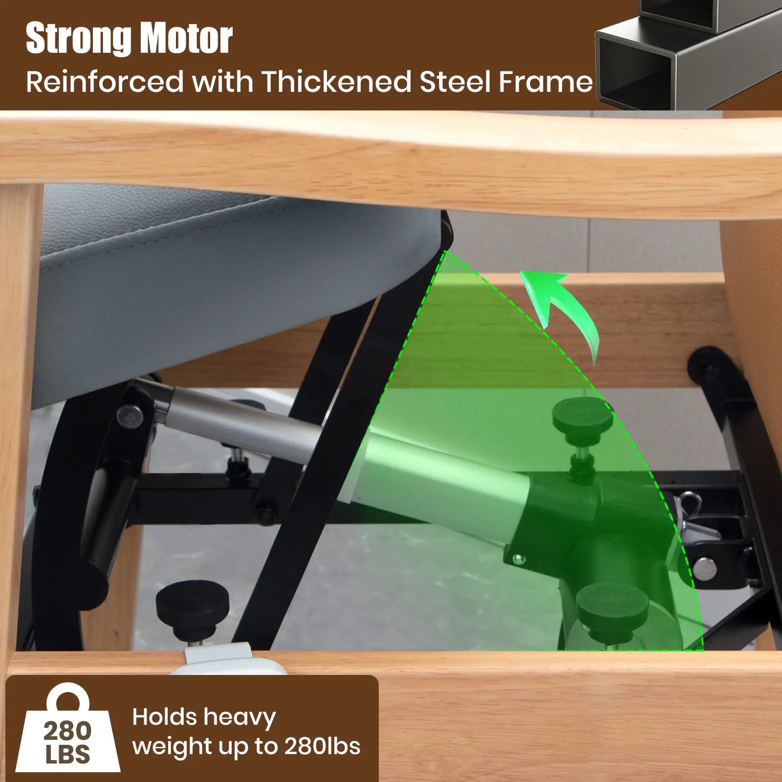 Engineered with heavy-duty steel tubing for enhanced strength and stability, this chair supports users up to 280 lbs. The powered lift mechanism offers a 20° recline and raises the seat by up to 8 inches, reducing strain on knees and joints.